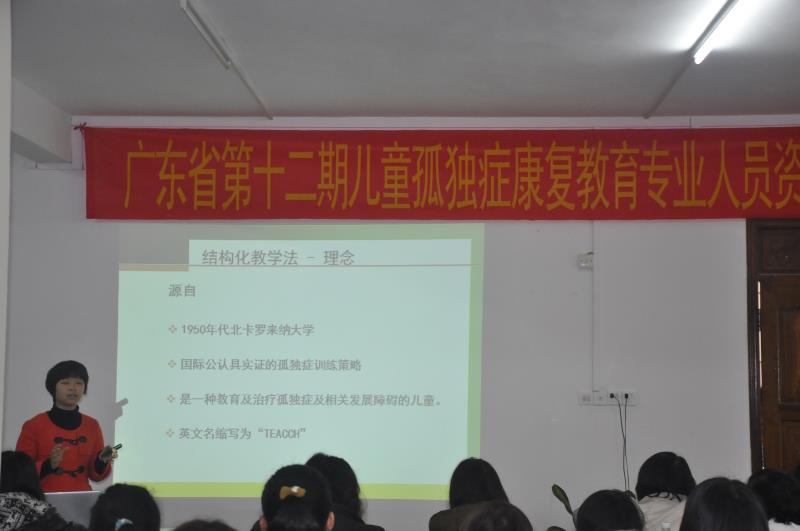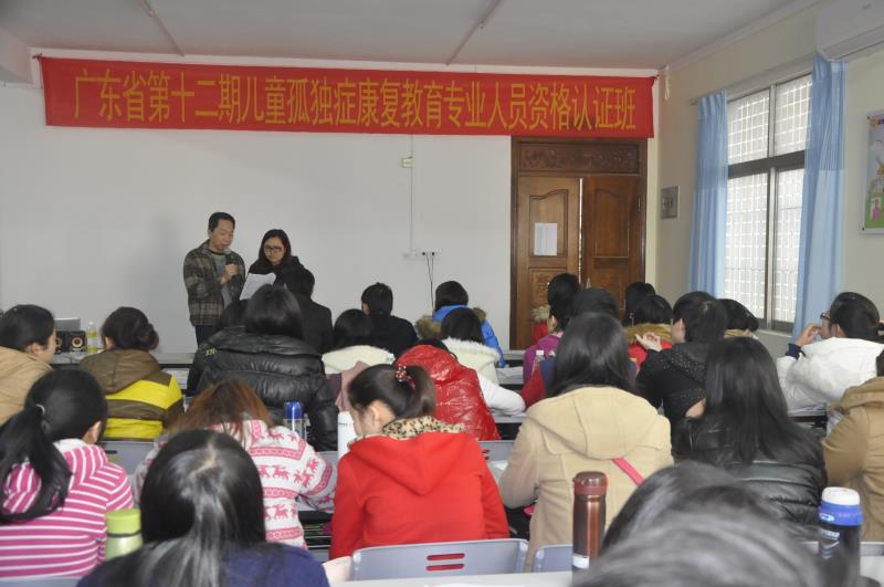 培训班从2月22号开始,到3月2号结束,共计9天,参加培训的学员均来自顺德从事自闭症康复教育的一线教师,有分别来自容桂星愿自闭症中心、大良星辰自闭症中心、顺德威权康复服务中心、容桂仁爱园的教师们,共计43人参加;参加授课的教师均来自广东省知名自闭症专家,分别有广东省残疾人康复协会陈旭红主任、黄庆均老师、广州市康复中心林国徽主任、广东省康复中心自闭症康复教育部张惠贤部长、广州市康复实验学校赖琼芳校长等;授课的内容从自闭症的诊断、评估到教学活动的设计、个别化教学计划、感觉统合训练、康复教学组织与档案管理到具体教学方法的介绍,各位老师进行了详细的讲述,保证了学员的学习质量;最后,本次资格认证班还进行了严格的理论和操作考试,考试合格的学员达30多名,考试合格的学员顺利的拿到了广东省自闭症康复教育上岗资格证。