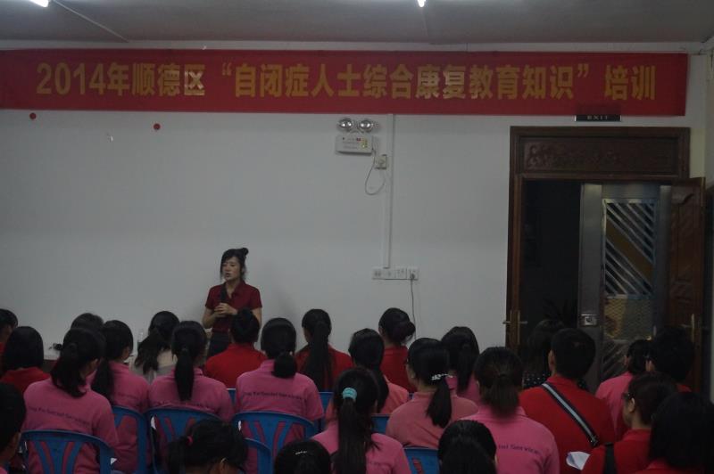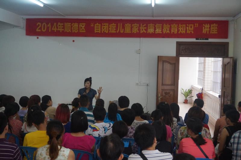 2014年,为了提升我区专业人员对自闭症人士康复教育技术及家长康复知识水平,同时提高自闭症人士康复治疗成效。我协会于9月邀请台湾自闭症家长协会总干事袁苗珊女士前来顺德,组织举办“自闭症人士综合康复教育知识”讲座,参加培训的学员均来自顺德从事自闭症康复教育的一线教师、治疗师及自闭症儿童家长,有分别来自容桂星愿自闭症中心、大良星辰自闭症中心、顺德威权康复服务中心,共计120人参加。授课内容从自閉症幼兒的思考能力特質、認知能力的指導、生活自理能力的指導这三大方面讲述自闭症儿童的康复知识。