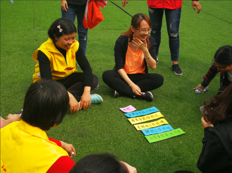 游戏最后,各队围坐在一起,分享刚刚在游戏中拿到的工作期望卡片,跟队友们阐述自己的工作期望,以及实现后的意义。趣味十足的游戏环节结束后,大家一起烧烤聚餐。