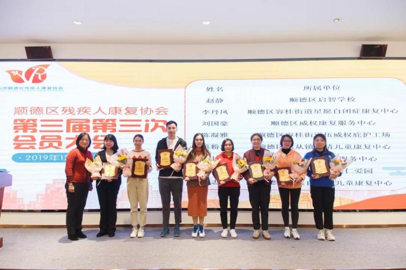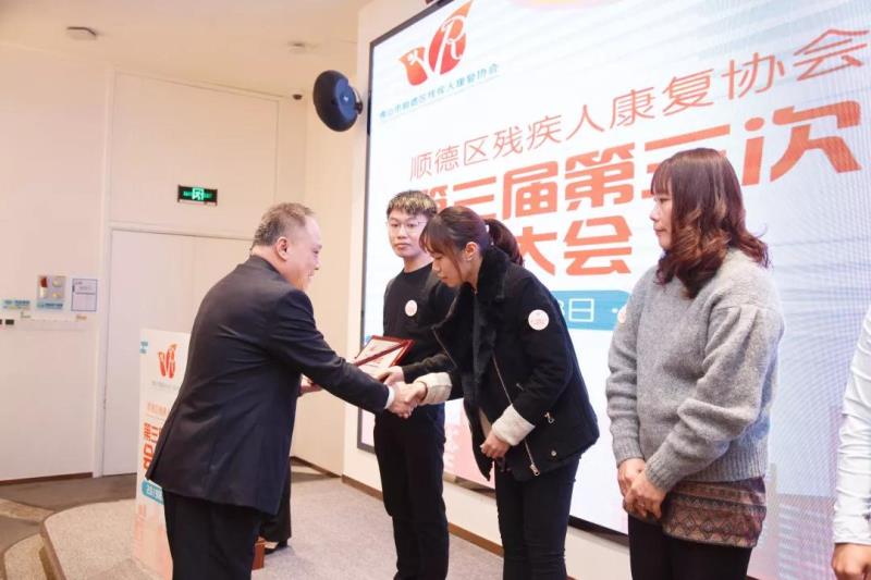 顺德区民政和人力资源社会保障局残疾人事务科科长陈毅雩先生以及顺德康协荣誉会长朱月霞女士对2019年顺德区“优秀康复工作者”进行授牌颁奖。