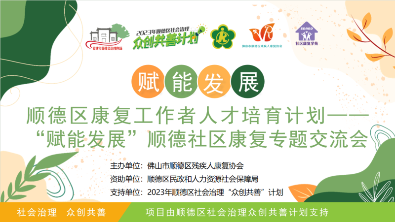 顺德区康复工作者人才培育计划—“赋能发展”顺德社区康复专题交流会,由2023年顺德区社会治理众创共善计划支持,顺德区残疾人康复协会主办,过程面向顺德区社区肢体康复工作者(即康复治疗师),展开具有针对性的康复专题交流活动。后续,顺德区残疾人康复协会将继续落实开展此类社区康复专题交流会活动,致力提升社区康复从业人员专业知识与实务技巧,促进服务经验的分享与传播。欢迎一同见证!